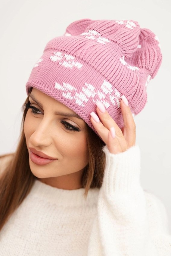Czapka damska zimowa dzianinowa z wzorem śnieżynek K463 ciemno różowa