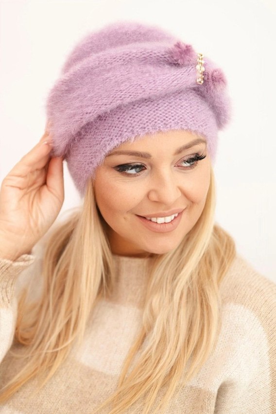 Czapka damska zimowa puszysta z ozdobą i futerkiem fioletowa