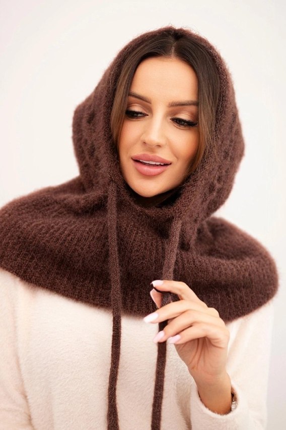 Brązowa czapka-kaptur damska z efektownym warkoczowym splotem i praktycznym wiązaniem