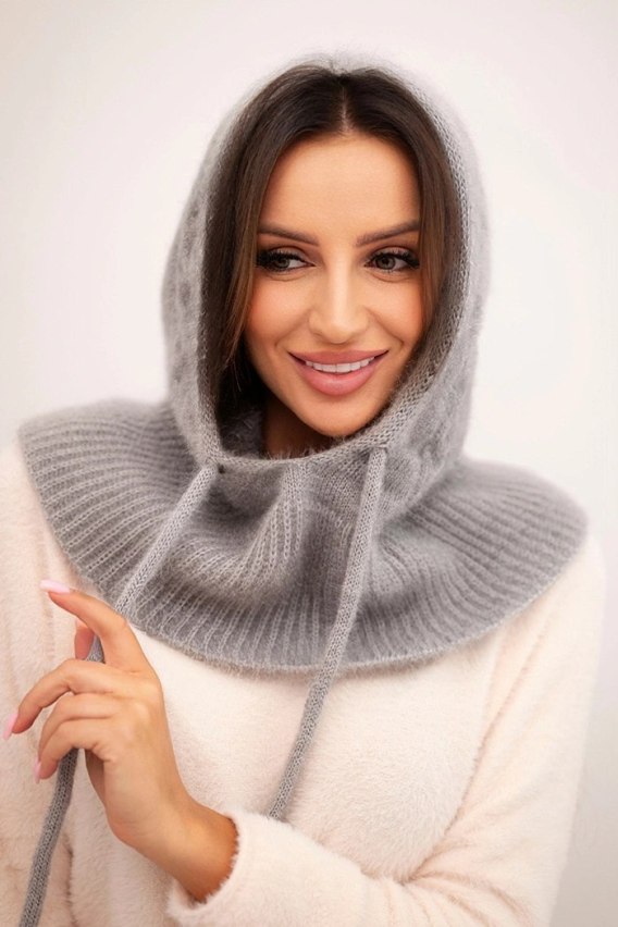 Czapka kaptur damski z wiązaniem i warkoczowym splotem szara