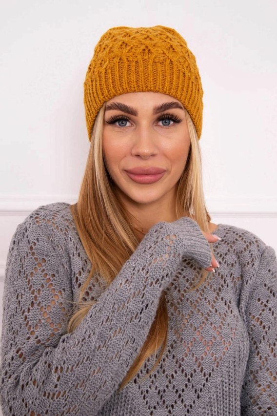 Stylowa musztardowa czapka damska zimowa z ciepłym podszyciem polarowym