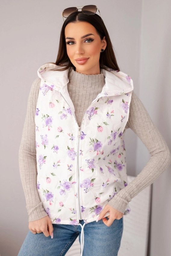 Kamizelka damska pikowana w kwiaty z kapturem fioletowa