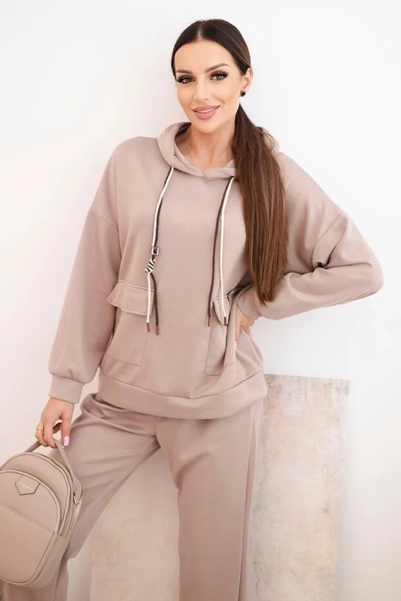 Ciemnobeżowy komplet damski masełkowy – bluza z kapturem i spodnie z paskiem
