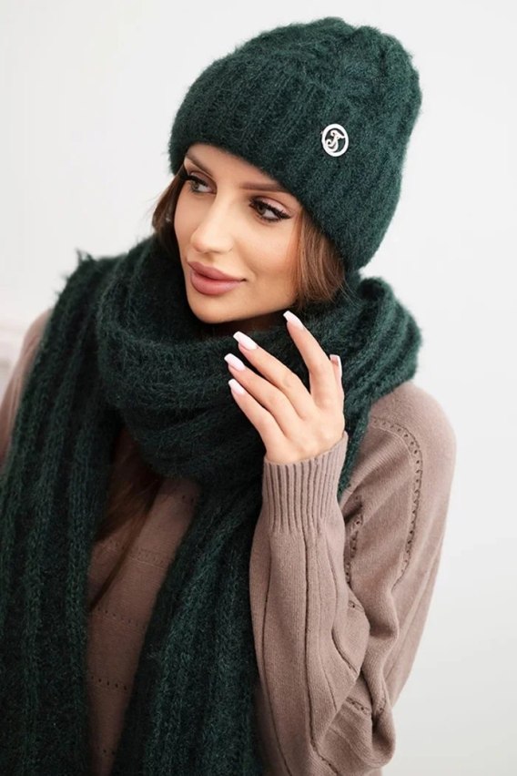 Komplet damski czapka i szalik prążkowany z ozdobą ciemno zielony
