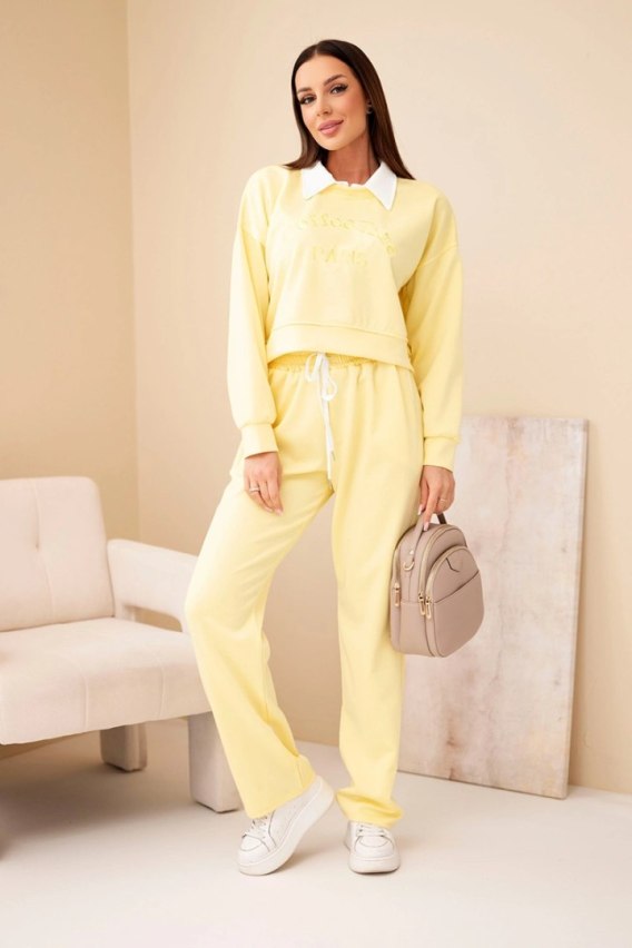 Komplet damski masełko bluza z kołnierzykiem i proste spodnie żółty