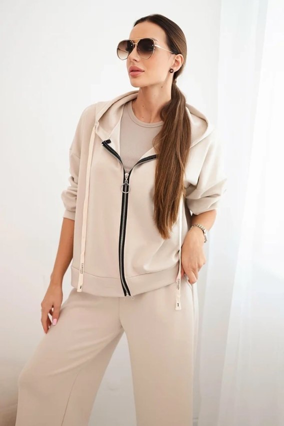 Beżowy komplet damski masełkowy – rozpinana bluza i spodnie z szeroką nogawką