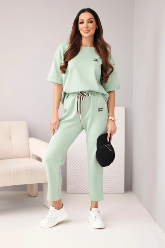 Komplet damski wiskozowy masełko z krótkim rękawem i spodniami z podwijaną nogawką ciemny miętowy