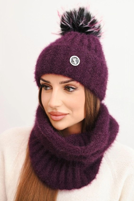 Komplet damski zimowy z pomponem i komin śliwkowy