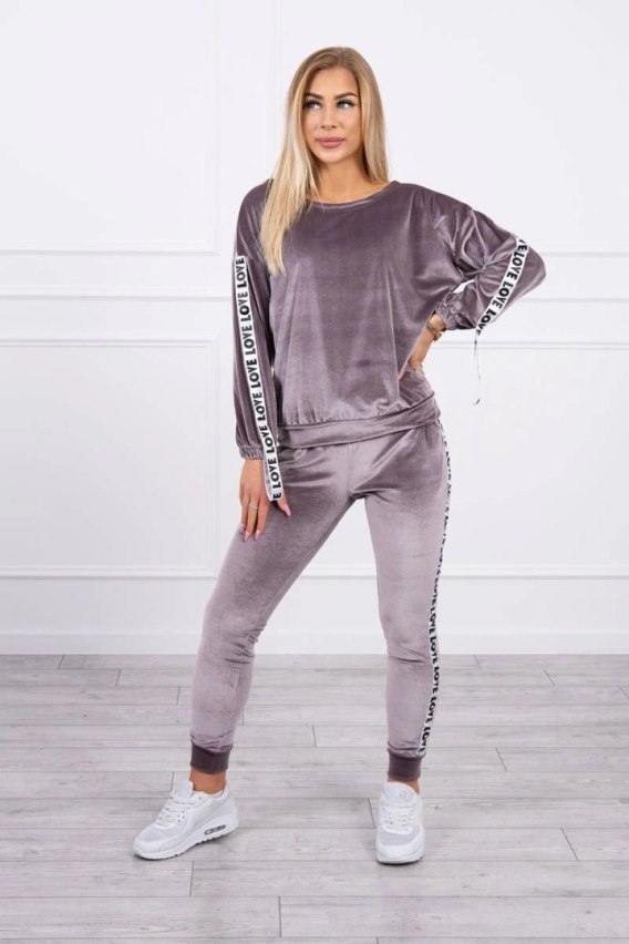 Prezentujemy Państwu komplet bluzy i spodni. Komplet wykonany z weluru. Bluza posiada taśmy z napisem Love. Spodnie z kieszeniami oraz wiązanie w pasie. Bardzo modny i stylowy komplet. Komplet wykonany jest z wysokiej jakości materiału. Rozmiar jest uniwersalny i będzie odpowiedni dla Pań w rozmiarze S, M lub L.