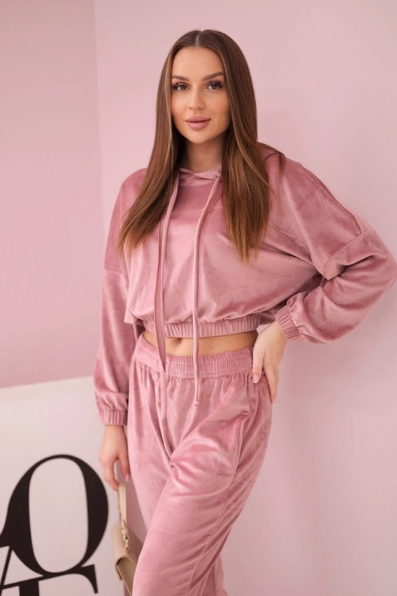 Komplet welurowy z kapturem ciemny pudrowy róż