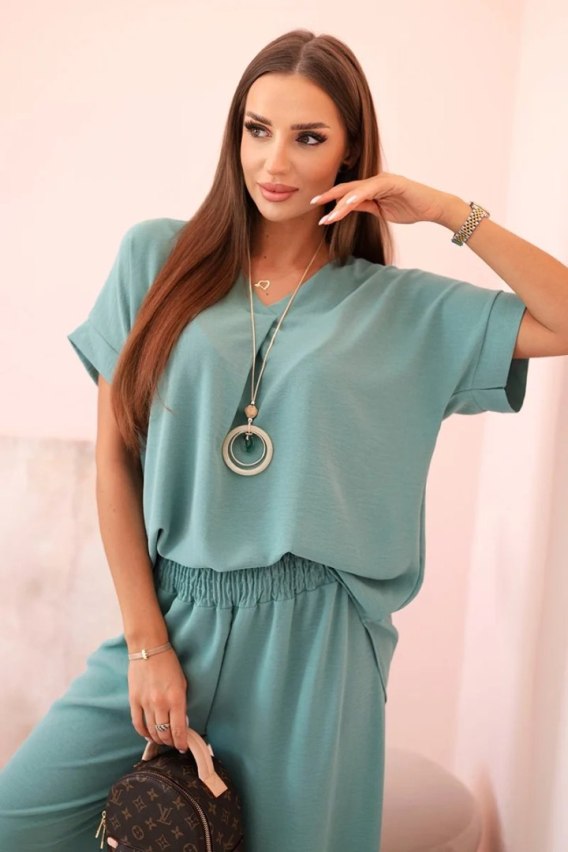 Komplet z naszyjnikiem bluzka + spodnie ciemny miętowy