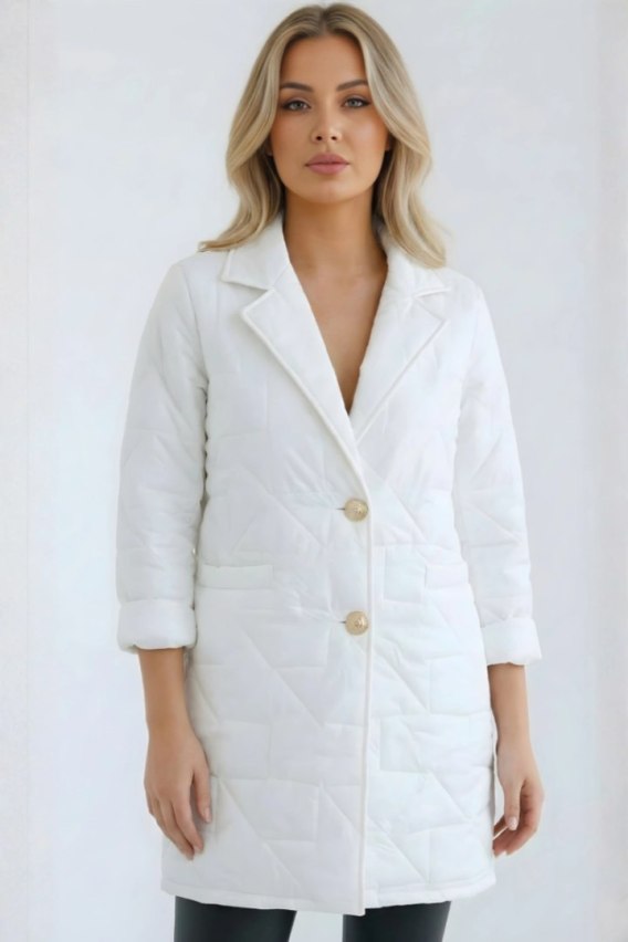 Kurtka damska Plus Size pikowana z ozdobnymi guzikami i kołnierzem biała