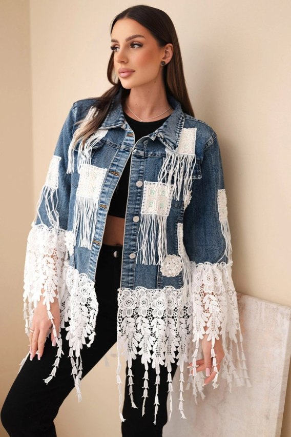 Kurtka jeansowa damska z frędzlami i koronką w stylu boho – ciemnojeansowy unikat