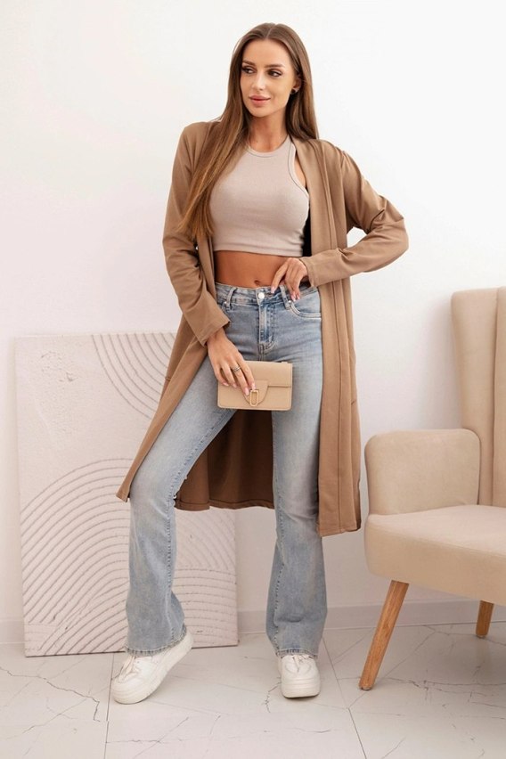 W przeciwieństwie do ciężkich kardiganów, talekka narzutka z długim rękawemzostała wykonana z wysokiej jakości bawełny z dodatkiem elastycznych włókien. Zapewnia to doskonałą cyrkulację powietrza i sprawia, że materiał jest niezwykle przyjemny dla skóry. Odcień camelowy (ciepły beż/karmel) to absolutny must-have, który nigdy nie wychodzi z mody i świetnie komponuje się z bielą, czernią oraz klasycznym jeansem.