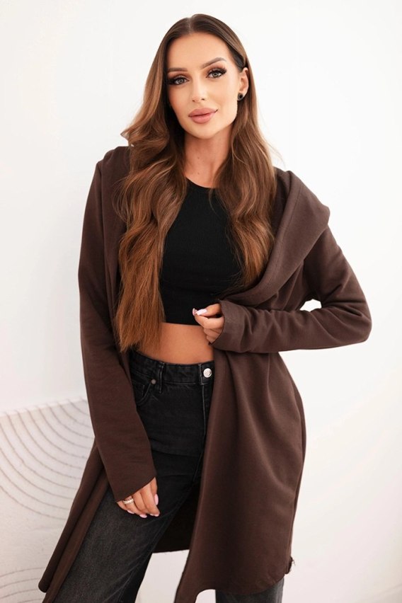 Narzutka damska z bawełny z kapturem i wydłużonym przodem brązowa