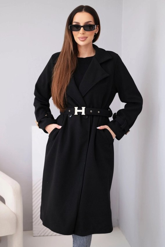 Płaszcz damski z paskiem i złotymi klamrami czarny