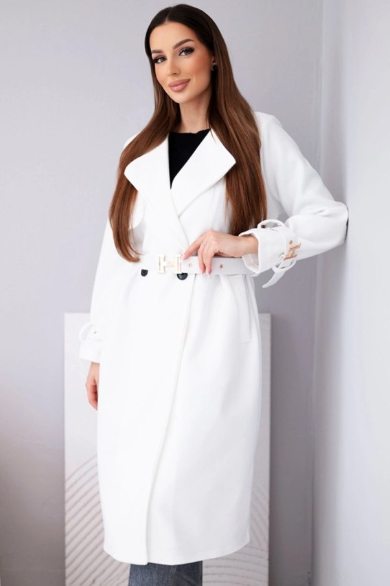 Płaszcz damski z paskiem i złotymi klamrami ecru