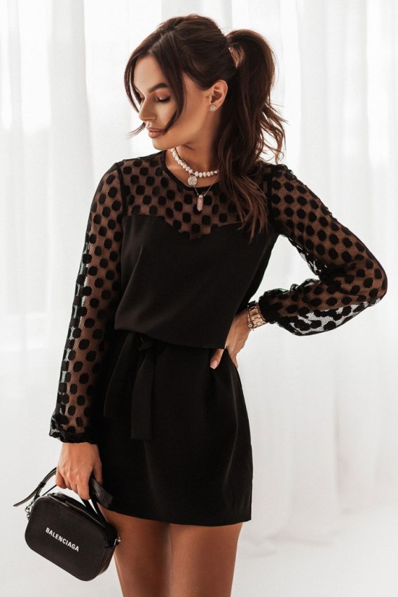 Klasyczna sukienka z długim siateczkowym rękawem o lekko bufiastym fasonie.
