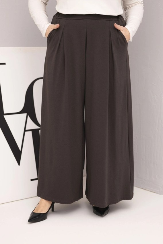 Stylowe i niezwykle wygodne spodnie damskie Plus Size o szerokiej, zwiewnej nogawce to idealna propozycja dla Pań ceniących komfort oraz modny, lekko oversize'owy styl. Dzięki bardzo szerokiemu fasonowi spodnie pięknie układają się podczas ruchu, tworząc efekt spódnicy typu maxi, a elastyczny pas zapewnia doskonałe dopasowanie bez ucisku.