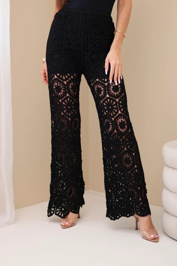 Spodnie damskie bawełniane ażurowe z szeroką nogawką elastyczny pas czarne