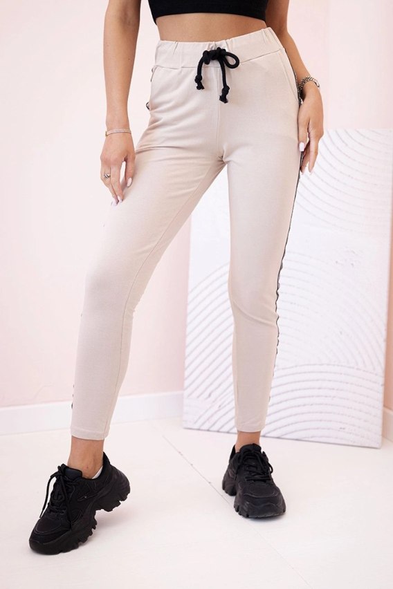 Spodnie damskie dresowe z lampasem i wiązaniem w pasie beżowe