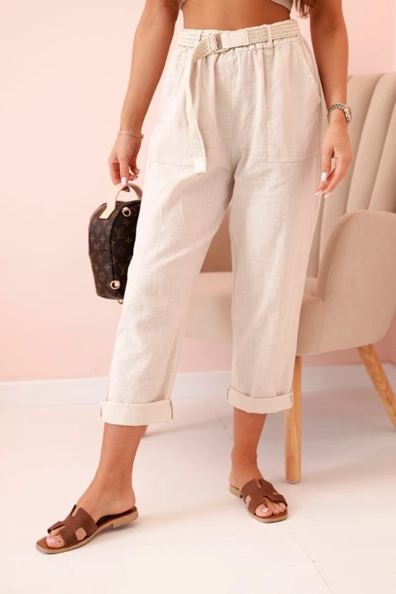 Beżowe spodnie damskie lniane z bawełną i paskiem