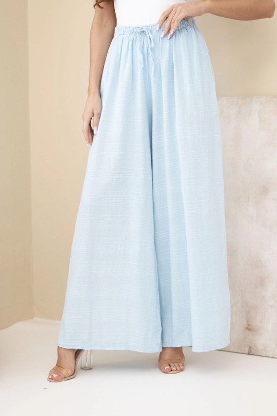 Modny fason wide leg w kolorze błękitu – optyczne wydłużenie i modelowanie sylwetki