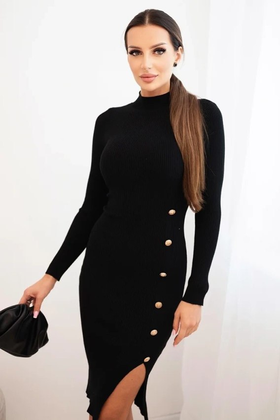 Sukienka damska prążkowana z golfem i ozdobnymi guzikami czarna