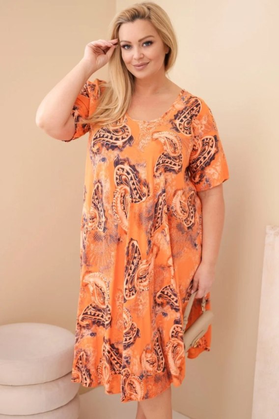 Sukienka damska wiskozowa Plus Size z krótkim rękawem i fasonem paisley pomarańczowa