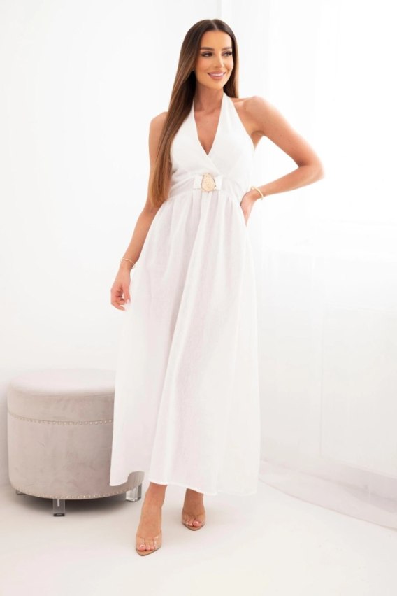 Sukienka damska wiskozowa maxi ecru – elegancki model wiązany na szyi z klamrą