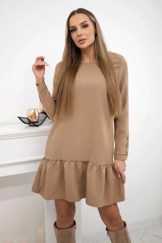 Camelowa sukienka z falbaną – luźny fason w najmodniejszym kolorze sezonu